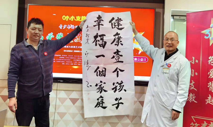 邓腾兰主任的讲话得到大家的一致认可和掌声!接下来知名画家亲笔为北京天使儿童医院写下该院一直坚持的宗旨:健康一个孩子,幸福一个家庭!并与戈光辉院长合影留念!