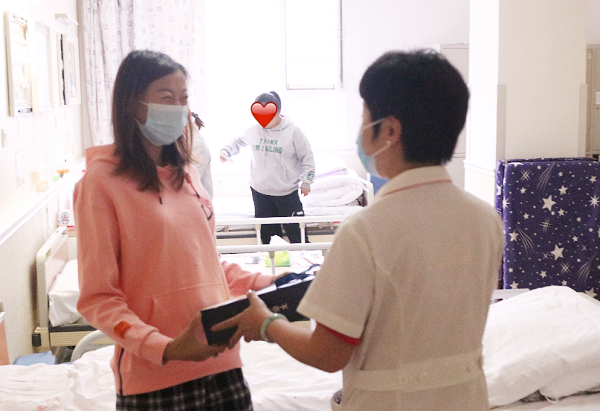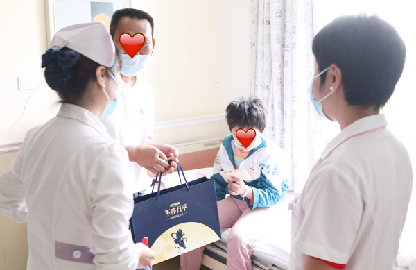 “中秋节快乐!”医务人员一边送上中秋节的月饼,一边送上祝福,朝夕相处中,医护人员打心眼里全心全意为患者服务,并鼓励孩子们安心养病,积极配合医护人员治疗,争取早日康复。此时的这幅画面,生动而温暖。