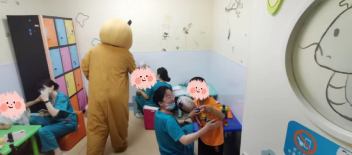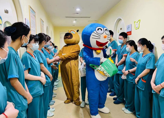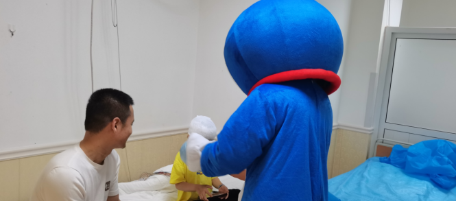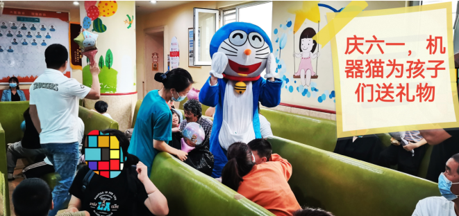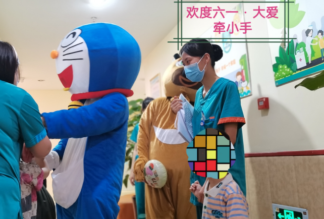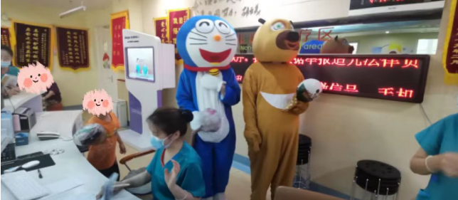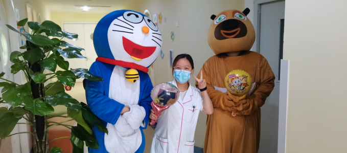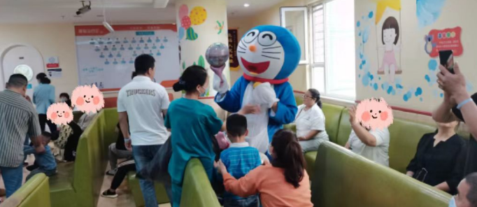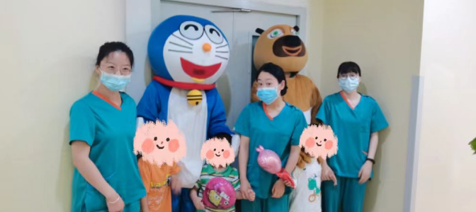 在科室主任和护士长的带领下,医护人员精心布置病房,张贴患儿们喜欢的动漫贴画儿,给住院患儿创造温馨舒适的环境,乐园式的氛围让小朋友徜祥在欢乐的益智世界中,并且隆重的“请”来了小朋友最喜欢的熊大和机器猫,一起陪着大家过六一。