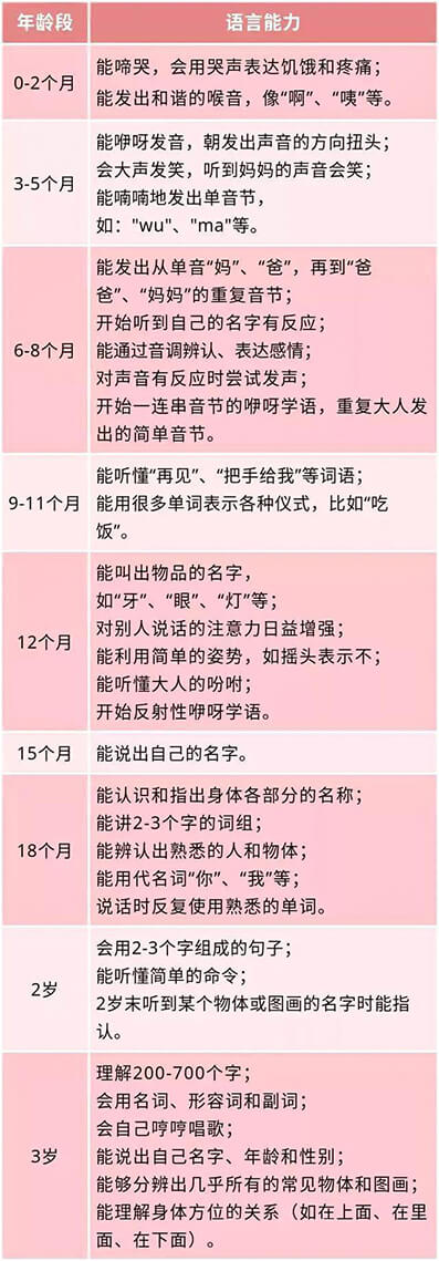1开口时间晚。开口说话以次说有意义的词语为标志,基本上都在1.5岁以后,大部分语言发育迟缓儿童在2-3岁期间开口说话,有的甚至要到4岁或者更晚才会开口说话。